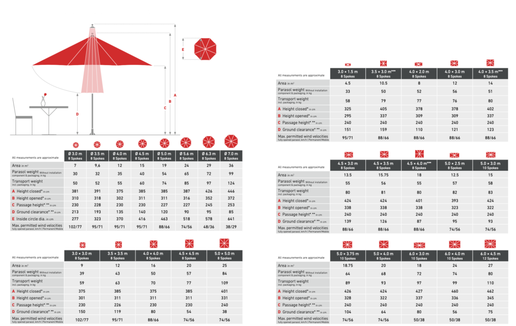Oferujemy do 111 miesięcy gwarancji na wiatr, w zależności od rodzaju montażu podłogowego i rozmiaru parasola, aż do maksymalnej siły wiatru 10 | 102 km/h.