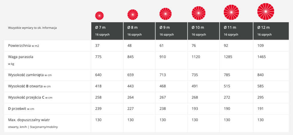 Waga parasola zależy od jego rozmiaru i wynosi około 775–1,655 kg, a wytrzymałość na wiatr osiąga maksymalną wartość siły wiatru 12 | 130 km/h. To doskonałe rozwiązanie dla klientów, którzy poszukują wysokiej jakości i wytrzymałego parasola o znakomitym designie i doskonałych właściwościach ochronnych.